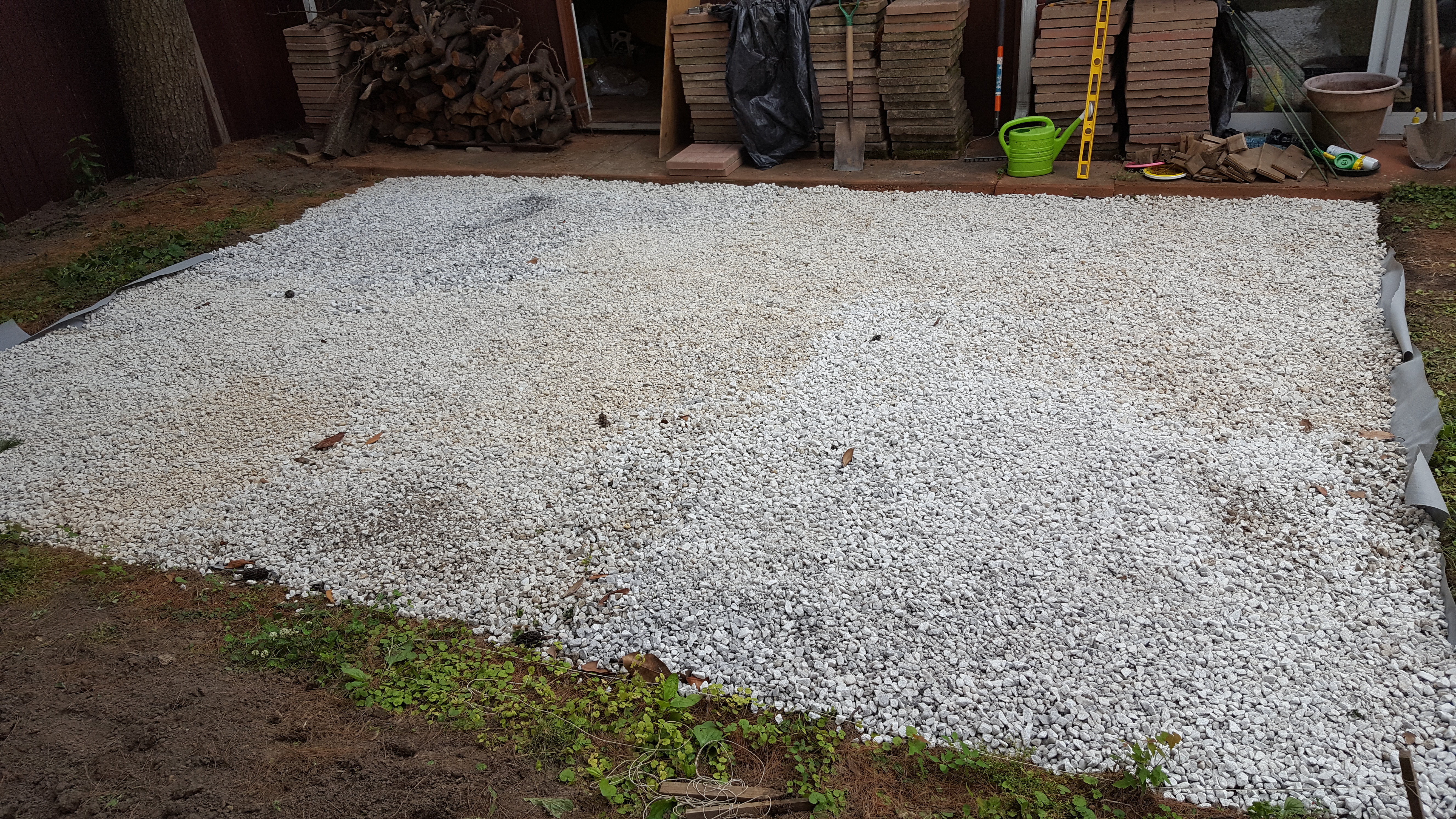 I know, change in angle. My bad. But we got all of the gravel down! We also bought more patio stones, which you can see stacked up in the background. Most of those are from the shitty non-patio we had before, which was sinking because it was just some stones laying in the dirt. So a lot of those will need to be washed off.