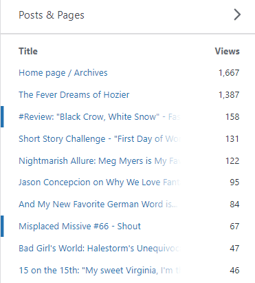 What’s more telling here is that my review of “Black Crow, White Snow”, an Audible Original, earned 158 views! I listened to that story basically as soon as it was released and loved it so much that I churned out the review within the first week. We had about a dozen search engine hits from people searching for the book title alone, and who knows how many other randoms.