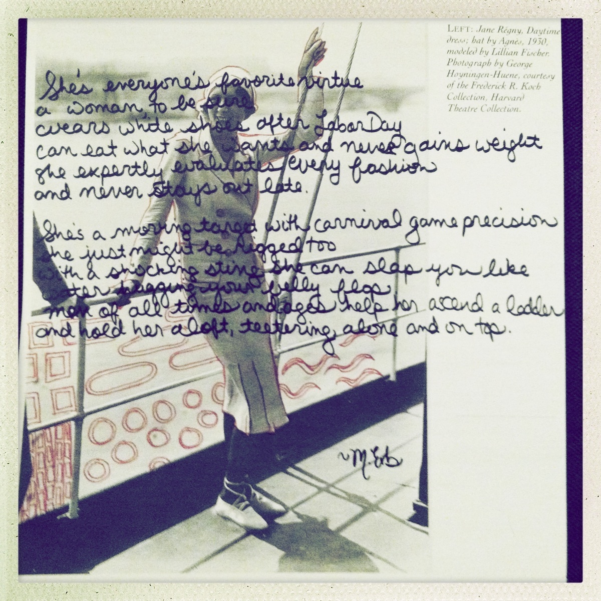 From a distance I label her the personification of humility Hands wrapped about herself, like the Virgin Mary, Her bronze shawl draped about her head, neck, breasts To shield her beauty and keep her modesty, even under glass.